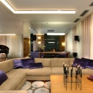 De belles plantes vivantes et des canapés violets aux coussins lilas qui se détachent sur un fond aussi clair animent l’intérieur.