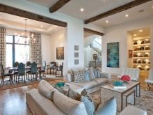 Dans une maison confortable, vous pouvez également combiner un salon avec une cuisine. Pour ce faire, la porte peut être enlevée complètement ou simplement remplacer la voûte. Si les locaux sont initialement combinés, alors l'espace peut être zoné à l'aide d'un compteur de barres, d'une partition basse ou d'une table haute. Avec un tel plan, la cuisine reste entièrement à la merci de l’hôtesse, tandis que la salle à manger s’installe dans le salon. C'est là qu'il y a une place pour une table et quelques chaises.