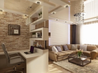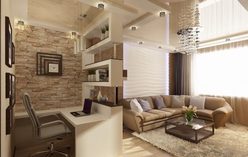 Même dans une pièce de 4 mètres sur 6, vous pouvez aménager une niche dans laquelle seront situés un bureau ou une petite armoire. Si la pièce est spacieuse, utilisez des écrans ou des cloisons pour créer un petit entraîneur ou une table avec des chaises.