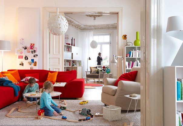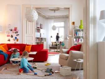 Les familles avec enfants adoreront l’idée de décorer un petit espace de jeux dans le salon. Pour ne pas trébucher autour de jouets épars, les enfants passeront du temps sous votre contrôle. Dans le salon, il suffit de remplacer la chaise ou le canapé par un tapis de jeu lumineux et un panier contenant des jouets. Vous n'avez même pas besoin d'acheter de partitions supplémentaires, surtout si les enfants sont déjà grands.