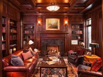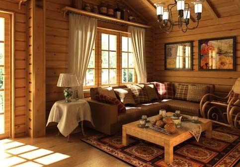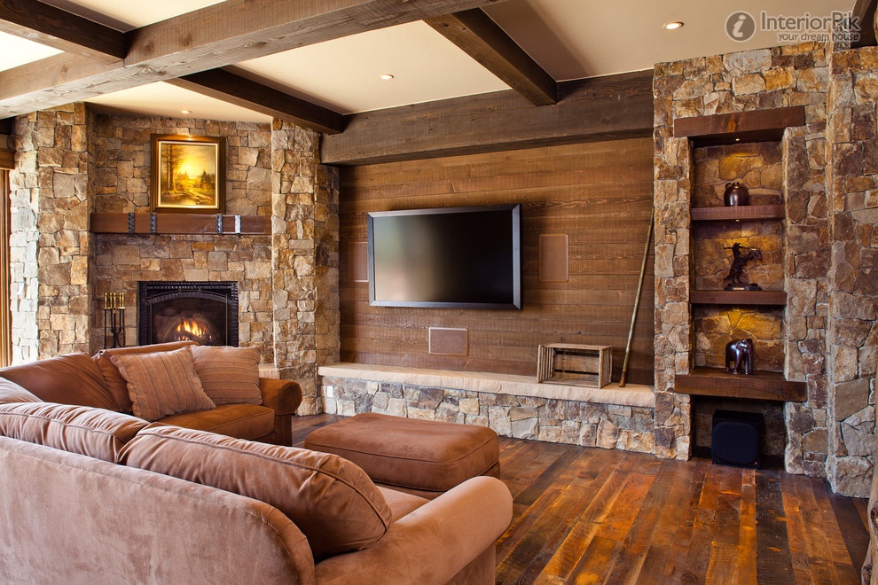 Les murs du salon d’une maison privée peuvent décorer non seulement du papier peint, mais également des revêtements en tissu ou des panneaux en bois. Convient également aux revêtements muraux, stylisés en matériau naturel - brique ou maçonnerie, par exemple. Si vous envisagez d’équiper le salon dans une maison en rondins ou en rondins, les murs peuvent ne pas être traités. Le look et l'arôme d'une belle bûche naturelle vous permettent de créer la bonne atmosphère.Par conséquent, les murs peuvent être décorés avec de petites peintures ou des affiches au lieu de cacher une telle beauté naturelle sous une couche de papier peint.