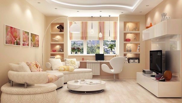 Cet exemple est une combinaison de minimalisme et de néoclassicisme. Même une très petite pièce semble plus grande grâce aux plafonds tendus reflétant la lumière, au papier peint léger et aux mêmes rideaux et plafond. En général, le salon lui-même est confortable et lumineux en raison du fait que il a une grande fenêtre. Il n’est pas nécessaire de se cacher, il est préférable de choisir un tulle fin, qui transmet un maximum de lumière. Et sur les bords de la fenêtre elle-même, il vaut la peine de suspendre des rideaux plus épais avec un beau motif de deux tons plus sombres que le tissu de base.
