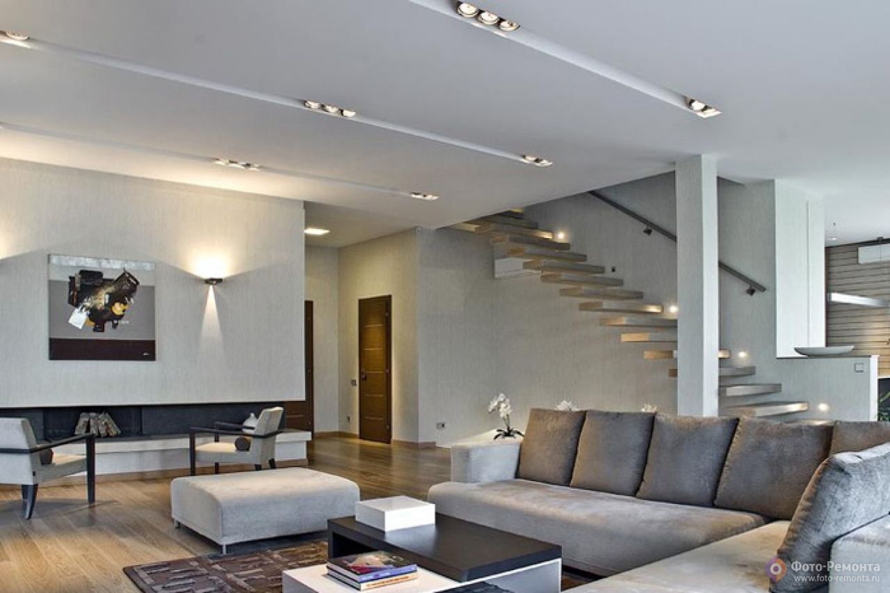 Pour cette raison, le plus souvent la zone pour les loisirs, ils s'installent soit au centre de la pièce, soit sous un mur libre. Si l'escalier prend beaucoup de place, vous pouvez placer le canapé et les chaises à côté.
