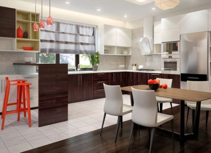 En plus des socles principaux, dans la cuisine, vous pouvez également organiser un bar confortable avec des chaises hautes et lumineuses. Cela rendra l’intérieur plus intéressant, plus lumineux et servira d’endroit idéal pour prendre une tasse de café chaud le matin.