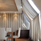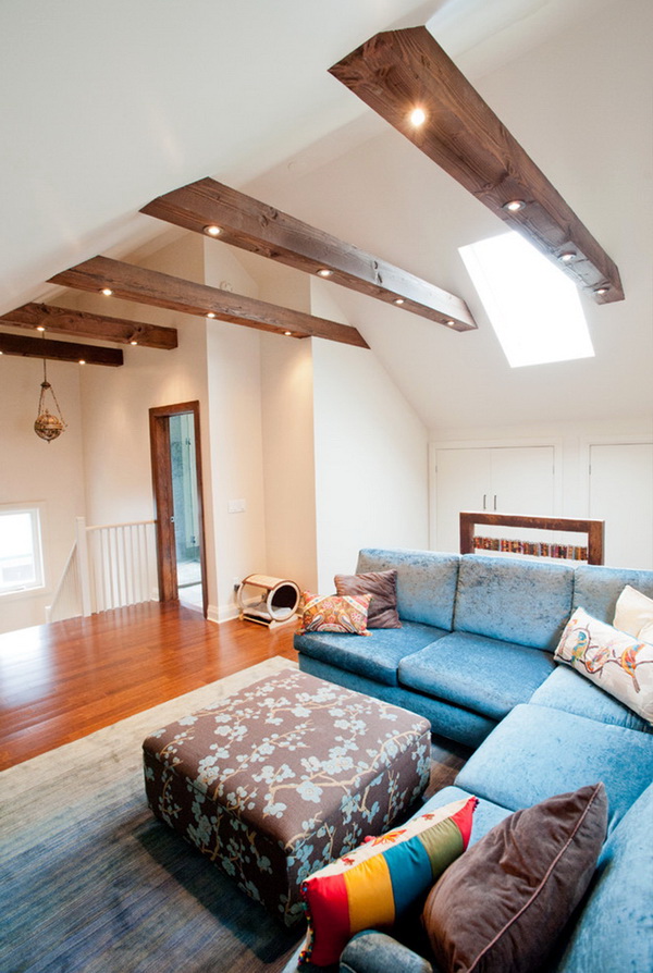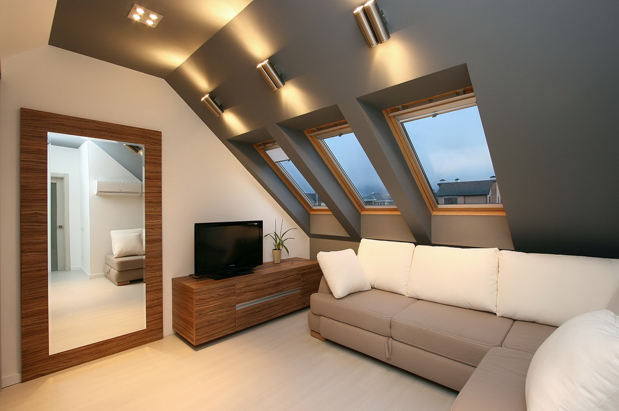 - Dans de telles pièces, l'éclairage est souvent insuffisant. Les fenêtres elles-mêmes peuvent se trouver sur la pente du toit, ce qui modifie la perception et permet de s'habituer à la configuration, limite la conception des fenêtres avec rideaux ou autres décorations.