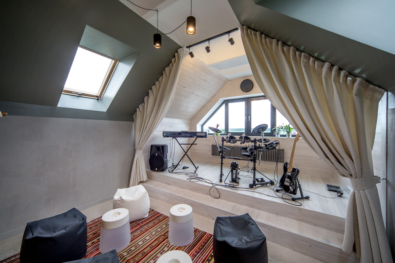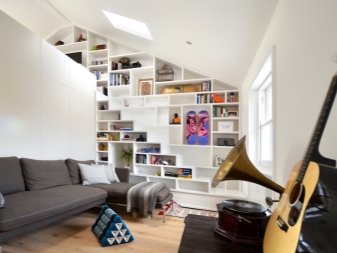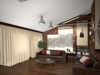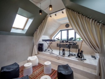 Si vous avez besoin d’équiper un coin musique d’un système audio, une partie du mur lui est enlevée, complétant ainsi l’espace détente avec un canapé ou un fauteuil confortable. Il est important de veiller à ce que la disposition de la salle ne soit pas difficile. Pour cela, les portes doivent être larges. Idéal si les plafonds sont hauts: cela vous permettra de les couper avec un revêtement matériel atteindre la direction stylistique souhaitée du design. Que l'intérieur n'a pas été surchargé, dans le grenier il ne devrait y avoir aucune confusion de styles.