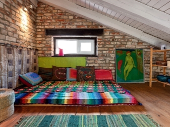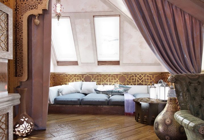 - si vous le souhaitez, vous pouvez recréer une tente orientale du grenier: pour un conte de fées oriental, vous devez équiper la zone près de la fenêtre d'un podium avec des coussins décoratifs de différentes formes, et la décorer avec des lumières individuelles et une tente-rideau;
