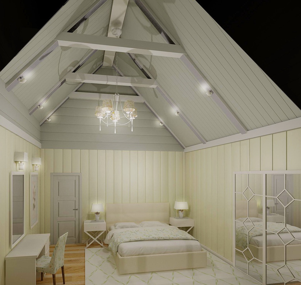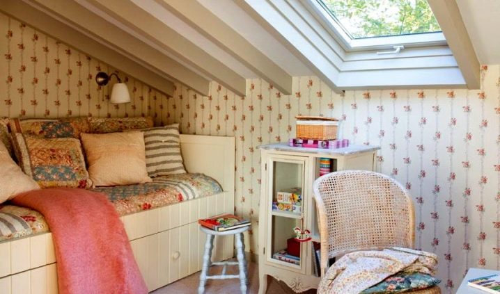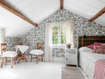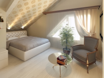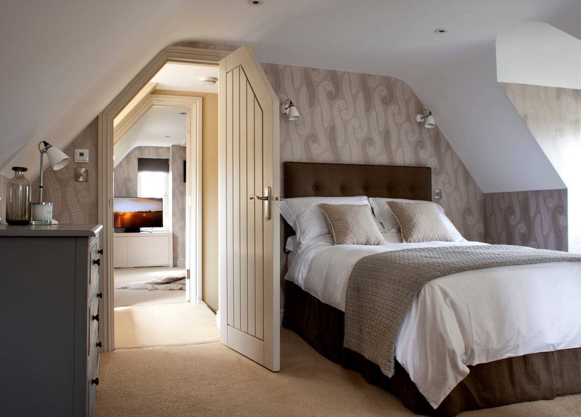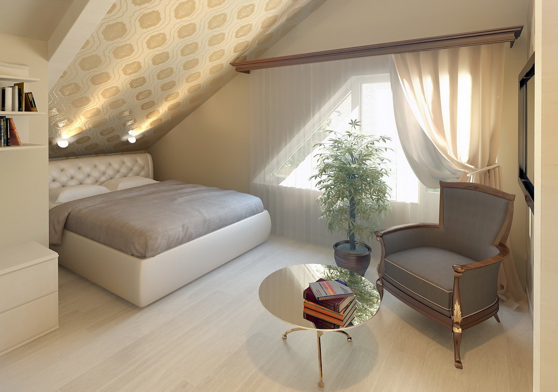 - vous pouvez utiliser l'espace du grenier sous la chambre: la chambre a toutes les chances d'être harmonieuse, si vous utilisez des compagnons de papier peint avec un fond uni et de la dentelle dans les murs, le ton du plafond et la couleur de la literie doivent être choisis en blanc, il est préférable de décorer le mur avec une niche intégrée, en le décorant d'un vase décoratif;