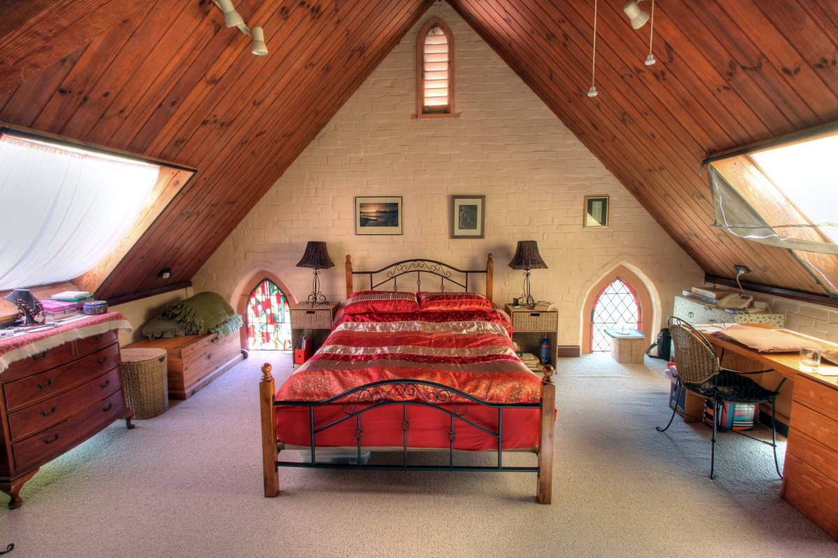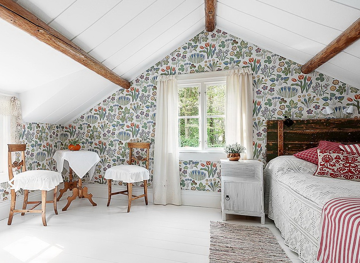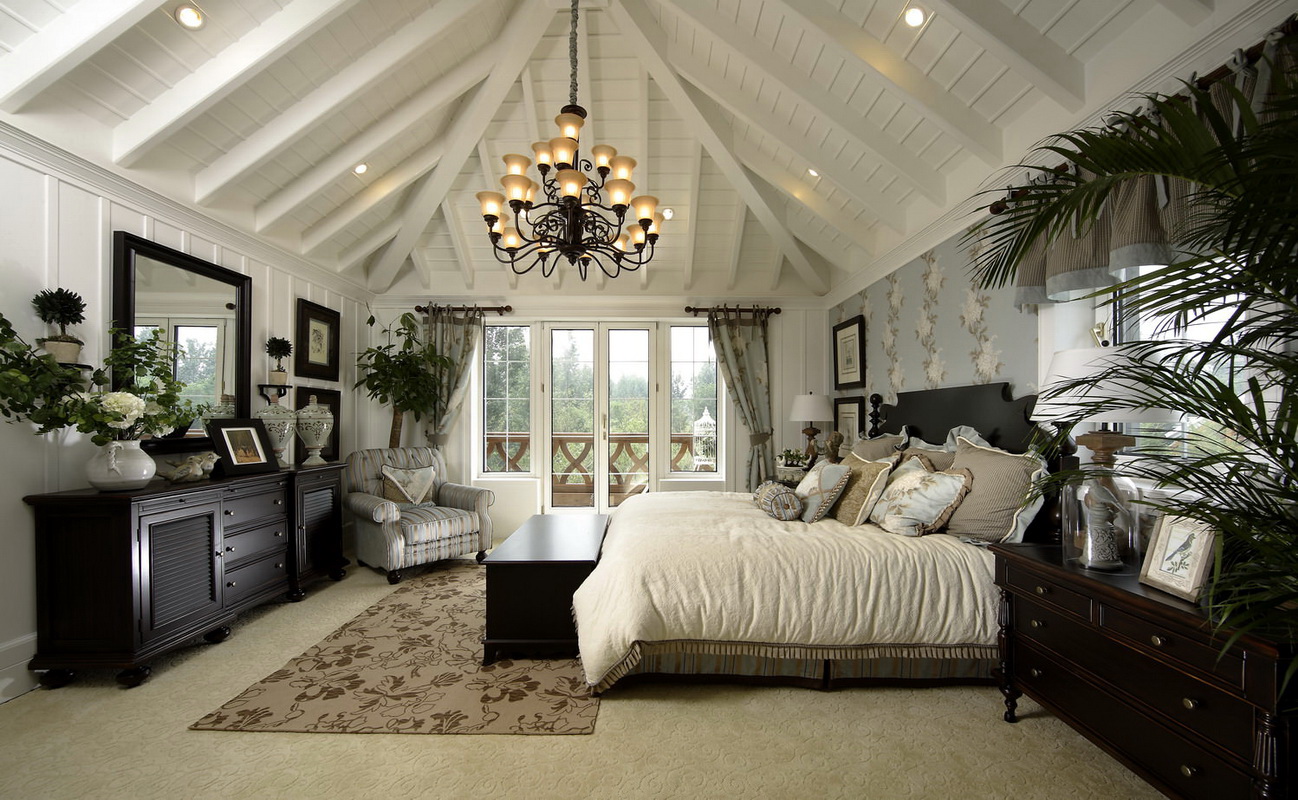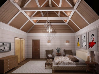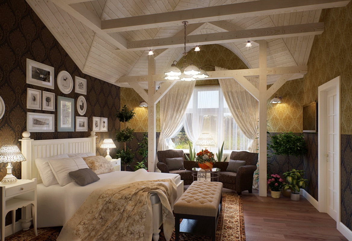 - vous pouvez utiliser l'espace du grenier sous la chambre: la chambre a toutes les chances d'être harmonieuse, si vous utilisez des compagnons de papier peint avec un fond uni et de la dentelle dans les murs, le ton du plafond et la couleur de la literie doivent être choisis en blanc, il est préférable de décorer le mur avec une niche intégrée, en le décorant d'un vase décoratif;