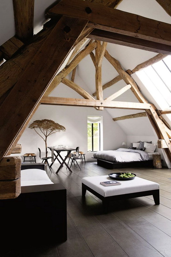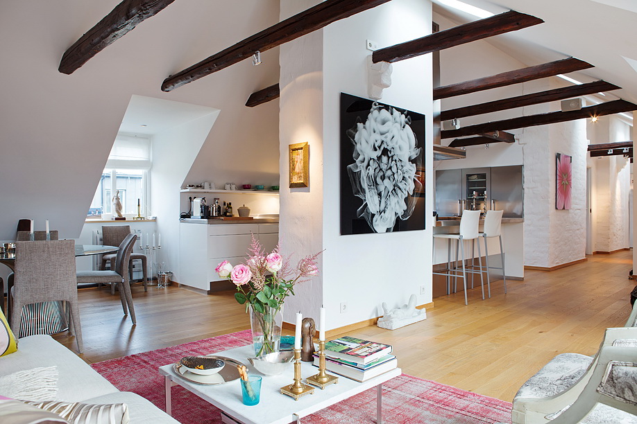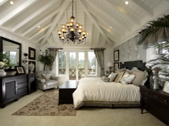 - Ne surchargez pas la pièce de meubles en abondance: dans la plupart des cas, le plafond est compliqué de poutres apparentes, ce qui rend le style lourd;