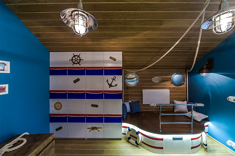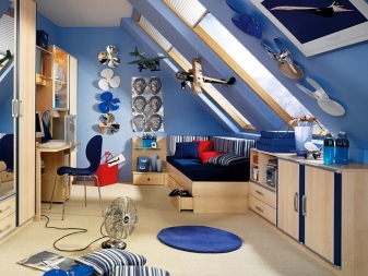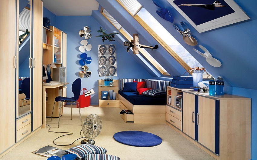 - Un grenier avec un toit en perspective cassé peut être aménagé sous la chambre de l’adolescent selon un thème marin: un hamac, une terrasse avec une imitation de terrasse, un bureau, un coin salon avec un canapé confortable et un revêtement de tapis moelleux créeront un design unique;