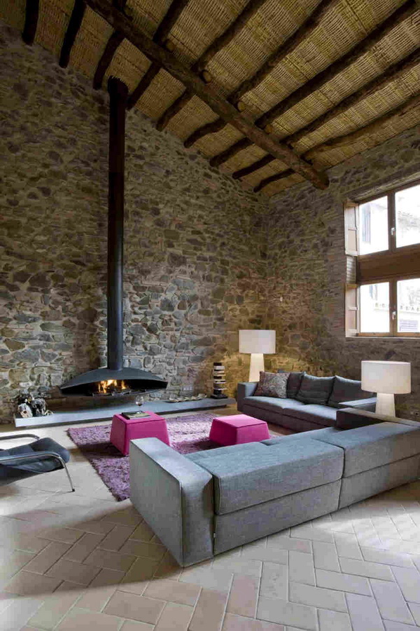Si vous avez besoin de créativité, vous pouvez essayer d’organiser une pièce avec une légère touche de style grunge et loft. Laisser une imitation complète d'un objet industriel est impossible, mais avec un grand espace, un agencement ouvert et l'allocation de murs en briques, cette ambiance peut être créée. De plus, les plafonds sont simplement créés pour cela: la présence de faisceaux et de communications est la marque de ce design.