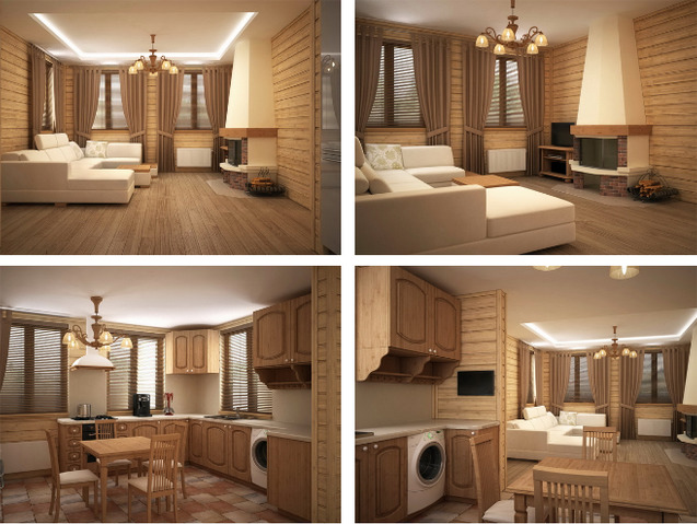 En bas, salon, salle à manger et cuisine aménagés. Nous ne devons pas oublier le réchauffement complet de toute la maison, à la fois au rez-de-chaussée et à l'étage supérieur pour qu'il soit confortable et qu'il ne fasse pas froid en hiver.