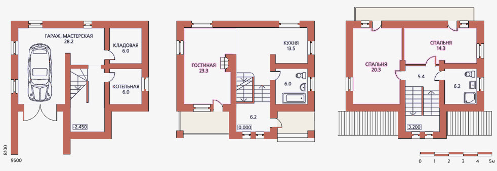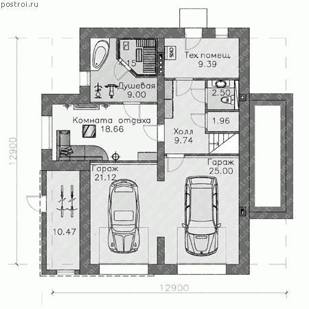 Il y a souvent des projets impliquant la présence du sous-sol. Dans ce cas, vous pouvez équiper le garage ici même. Cela contribuera à économiser de l'espace et à rendre l'aspect général de la maison plus intéressant. À côté du garage, vous pouvez organiser un bain ou un hammam. Dans le camp, elle ne dérangera personne, en même temps, ce qui lui donnera l’occasion de se mettre à l’aise.