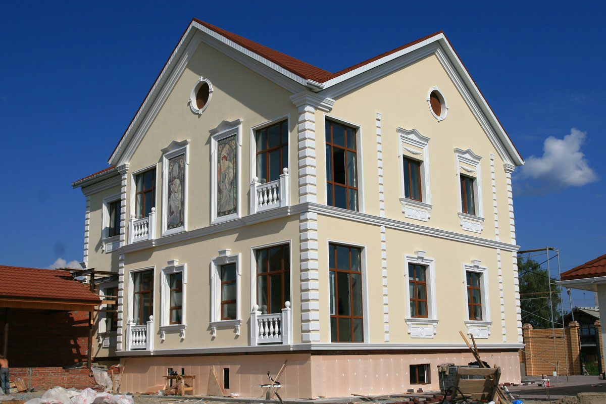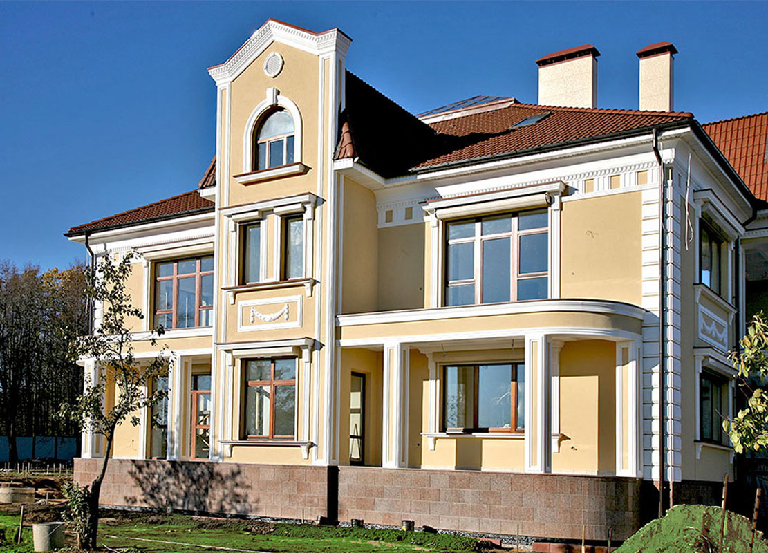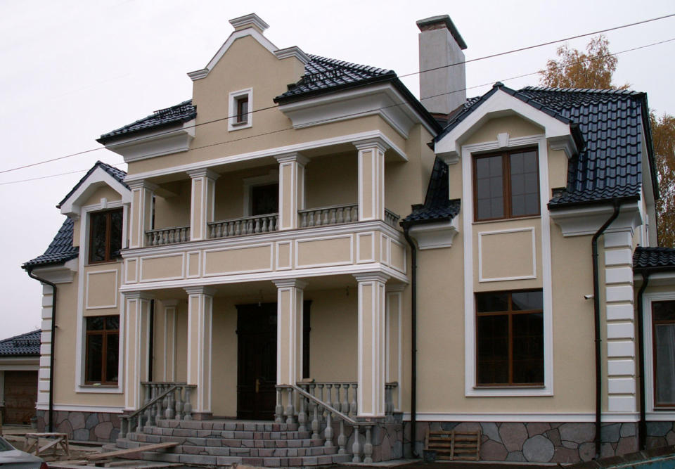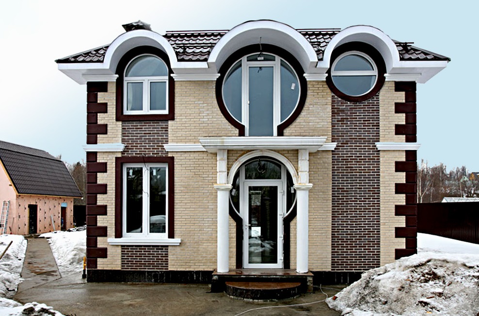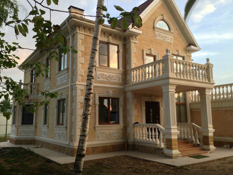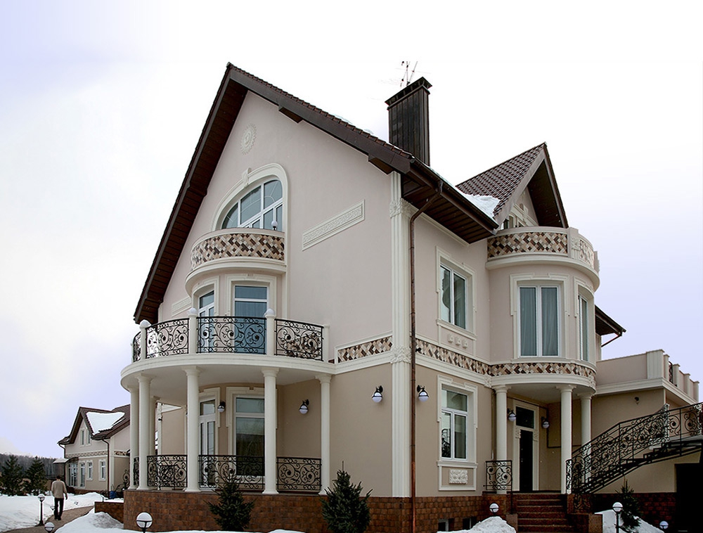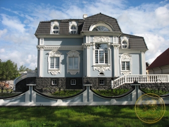 - Moulage - Ce sont des pièces aériennes préfabriquées.Les moulures rectangulaires, c'est-à-dire de longues bandes de couleur contrastante, sont capables d'interagir activement avec la surface du mur de façade en le structurant d'une manière ou d'une autre. Le décor moulé est également utilisé, par exemple, un mur plat peut être décoré avec un cadre de recouvrement avec un ornement floral au milieu.
