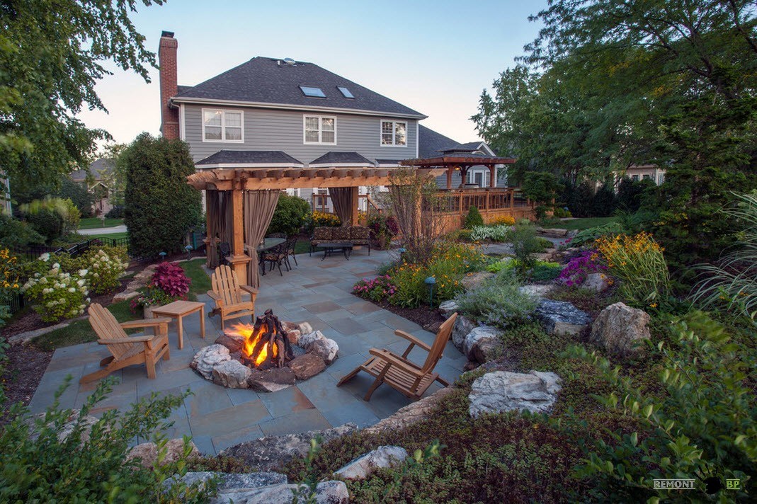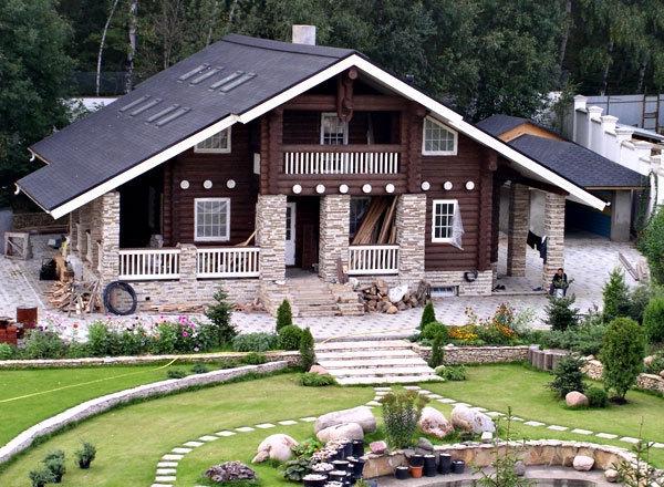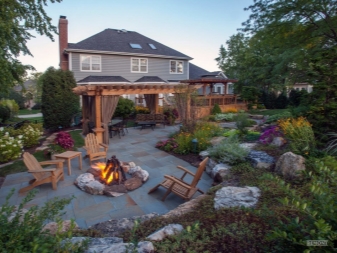 Absolument tout autour du bâtiment, y compris des bancs et une clôture, devrait travailler sur «l'image» du bâtiment principal. Les contours nets et rectangulaires du garage et des dépendances conviennent bien au style high-tech, mais pas au chalet. Le matériau qui a pavé la voie n’est pas moins important que le revêtement de la façade. Gazebos recouverts de lierre, parterres de fleurs, toboggans alpins, sculptures, réservoirs artificiels - nous percevons tout cela dans une unité indissoluble avec la maison et, par conséquent, tout cela doit être élaboré dès la conception.