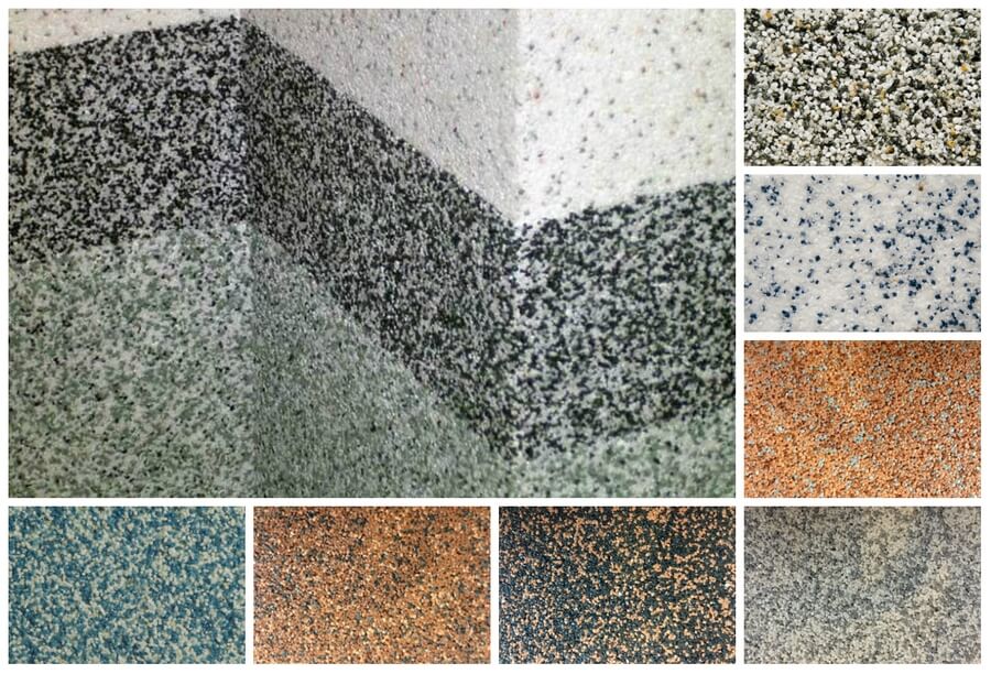 Le granit et les éclats de marbre, ainsi que le mica, l'anthracite, le verre, le quartz et de nombreux autres matériaux sont utilisés comme charge décorative. Les enduits de façade sont caractérisés par le type et la taille de la charge, en fonction de la technologie appliquée au mur, de la méthode de peinture.