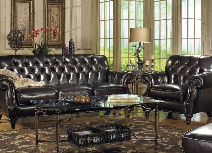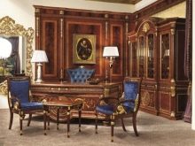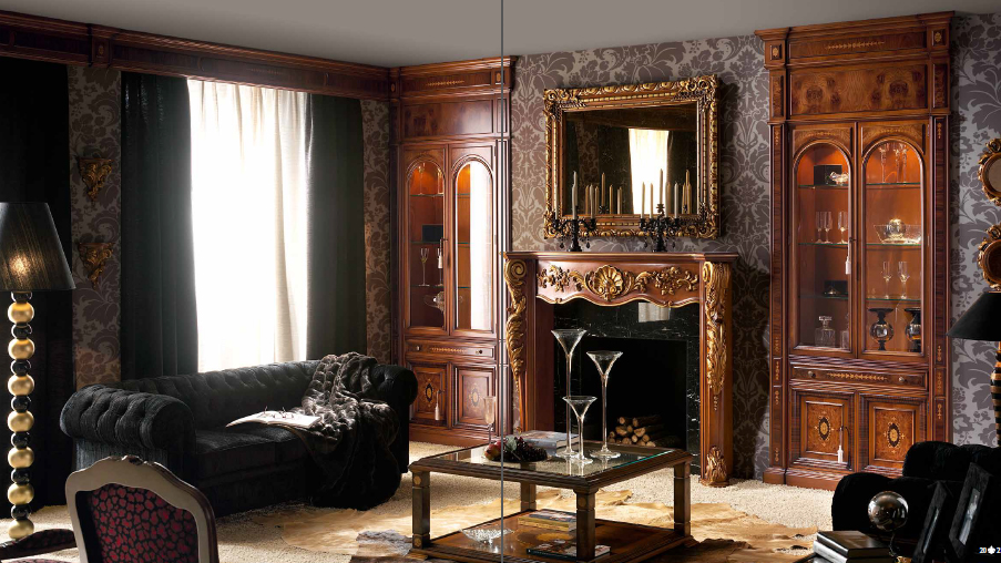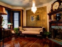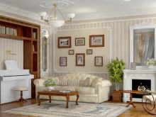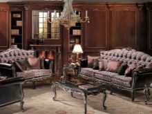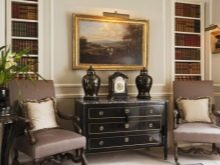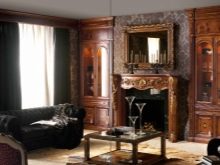 Un canapé ou des fauteuils avec «oreilles» sont placés en face de la cheminée et sont situés au centre du salon. Un attribut incontournable du salon est une table basse classique en bois naturel. Tous les meubles doivent avoir des lignes lisses et claires et de fines jambes sculptées. Vous pouvez compléter l’intérieur du salon avec un pouf en velours pour les pieds et un support en métal forgé pour les accessoires de la cheminée.