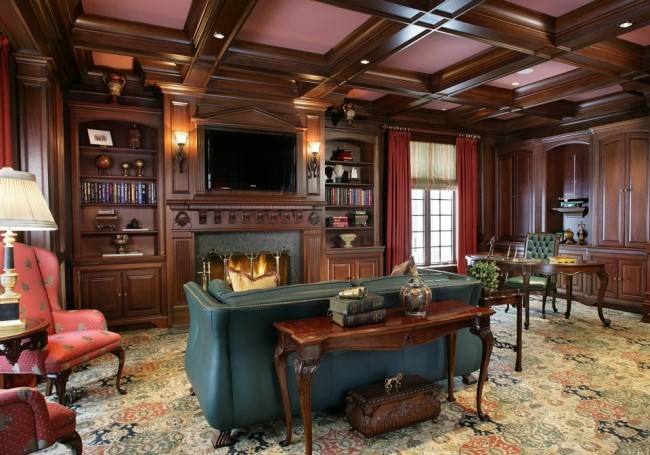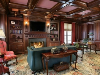 Car le style anglais se caractérise par un grand nombre de bois à l'intérieur.Idéal pour la décoration intérieure en acajou. Matériau coûteux et élégant complète parfaitement le style conservateur. Et cela concerne non seulement le sol, le plafond et les plinthes, mais également les poutres de plafond et les panneaux muraux associés au papier peint.