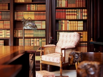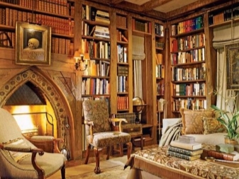 Dans la maison anglaise il doit y avoir une grande bibliothèque avec la meilleure collection d'œuvres classiques du monde. Vous pouvez lui attribuer une pièce séparée ou un mur avec la chaise et la lampe de sol adjacentes. Les étagères sont en bois et montent droit au plafond.