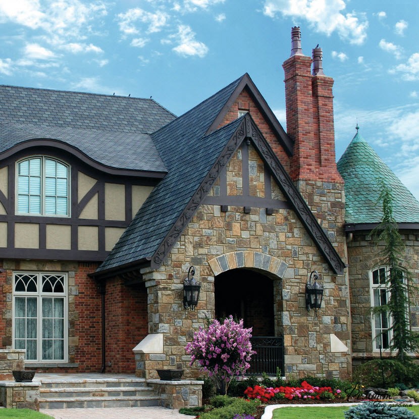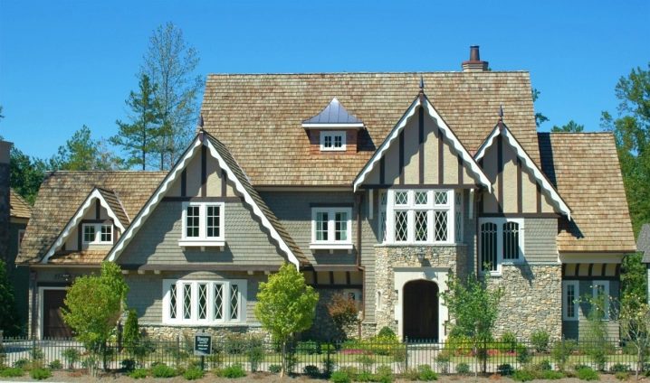 En raison de la configuration complexe du toit, la forme du toit est élevée. Le toit pointu du style anglais est difficile à confondre avec une autre solution architecturale ou de conception. Raide, avec des carreaux rouges ou sombres - Considéré comme une sorte de carte de visite.
