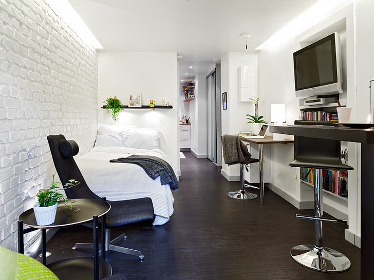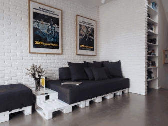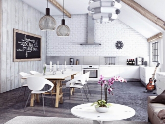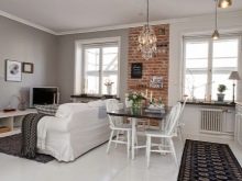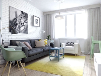 Pour que l'atmosphère dans la pièce ne semble pas trop stricte, une attention particulière doit être portée à la couleur du matériau et aux spécificités de la décoration. Un exemple est la décoration des murs en briques blanches, complétée efficacement par des tons clairs et gais.