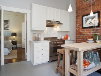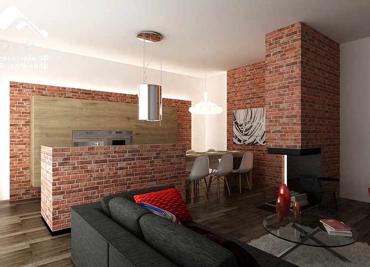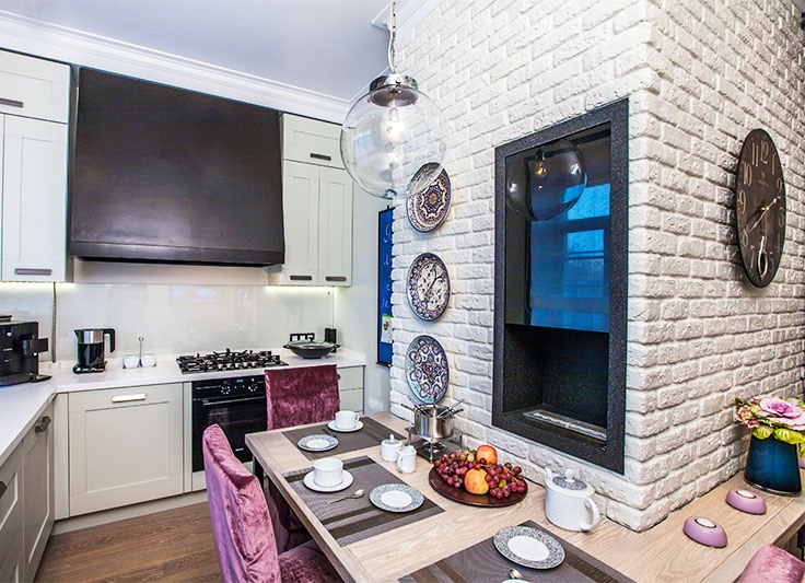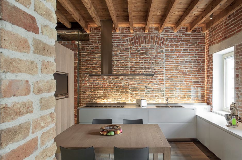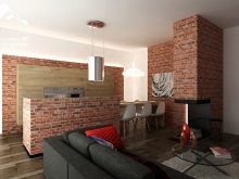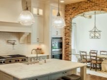 - Cuisine L'utilisation de briques vous permet de zoner l'espace, par exemple en mettant en évidence la zone de la table à manger. Une des meilleures solutions est la tuile en brique, grâce à laquelle vous pouvez décorer un tablier et finir l’îlot de cuisine.
