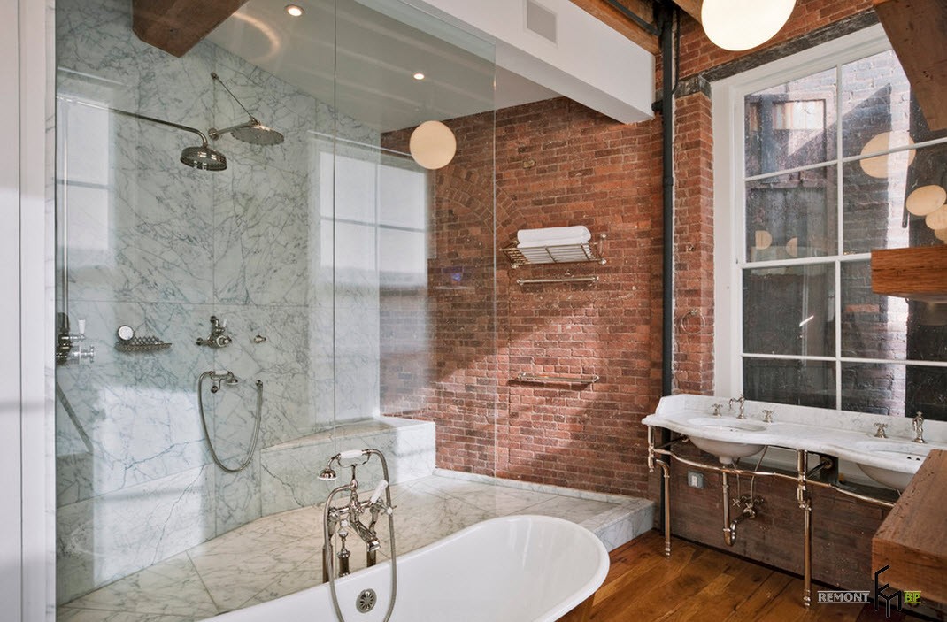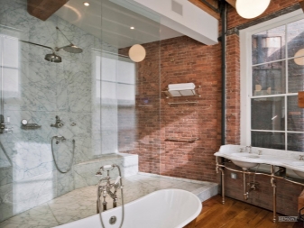 - Salle de bain. La meilleure solution pour cette pièce est la brique de verre. En raison de leur solidité, ils peuvent être à la fois beaux et fiables pour la décoration du sol.En ce qui concerne les murs de la salle de bain, il est raisonnable de les décorer avec une imitation de brique résistante à une exposition régulière à l'humidité.