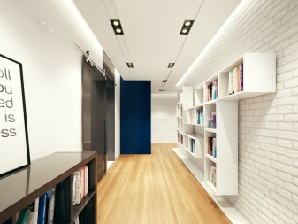 - La brique n'interfère pas non plus dans le couloir: en utilisant des carreaux avec un bord «endommagé», vous pouvez zoner avec succès la pièce transformée. La finition, réalisée dans des couleurs vives, est particulièrement impressionnante. En outre, de nombreux designers conseillent de placer des bougies décoratives et d’autres éléments originaux sur des briques saillantes.