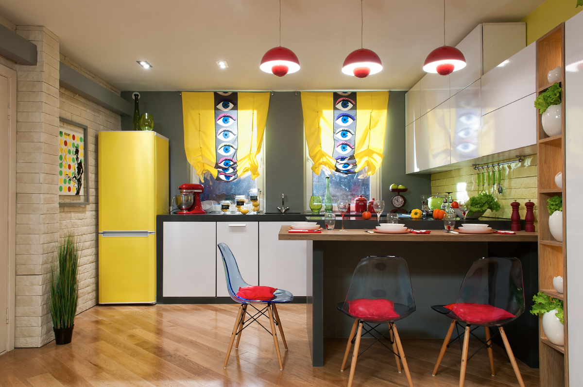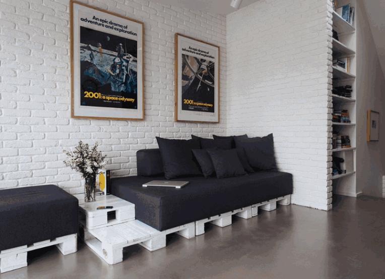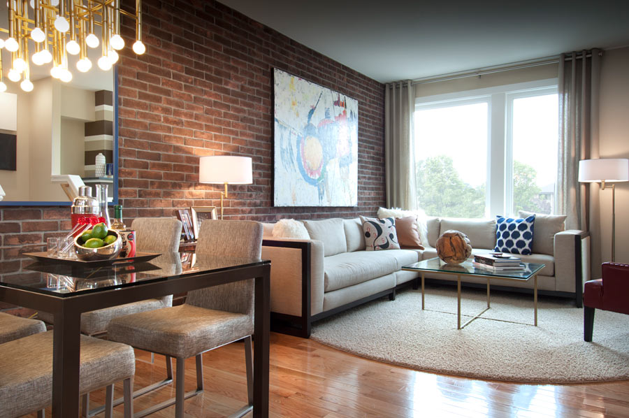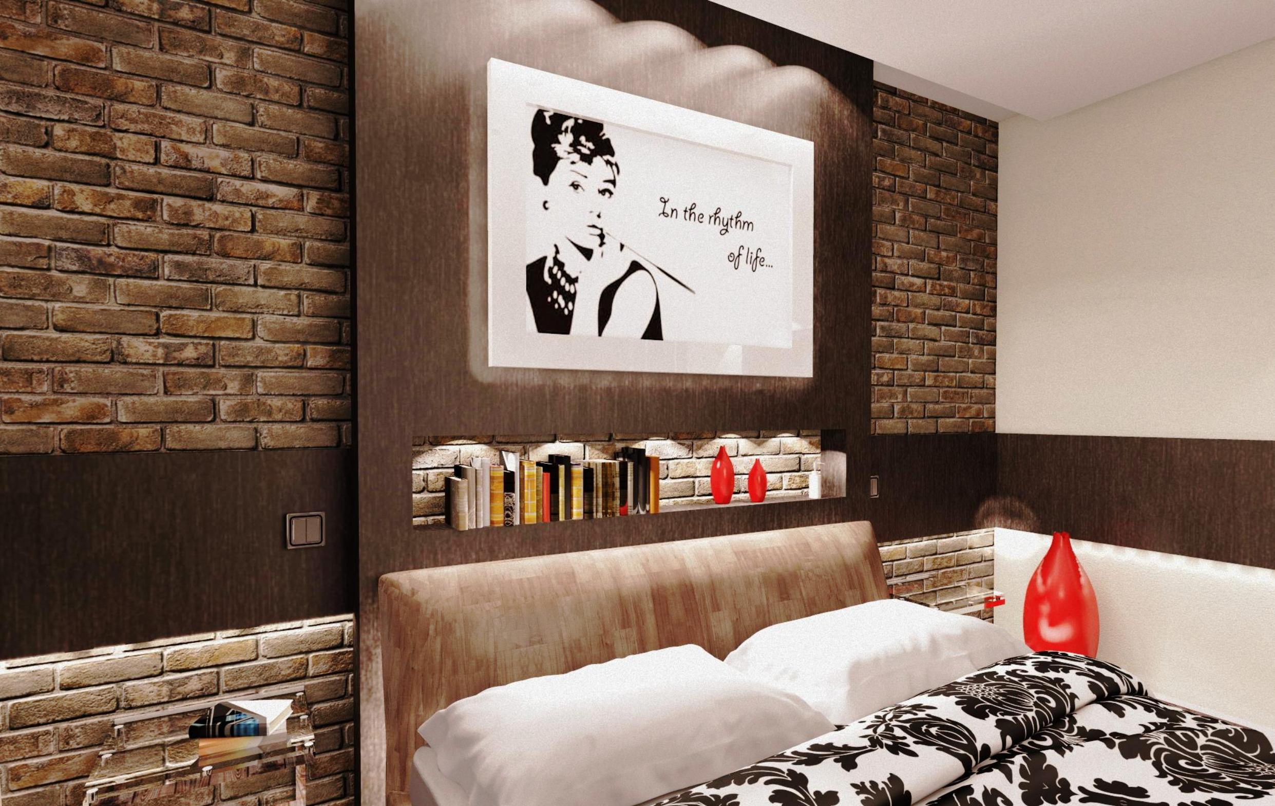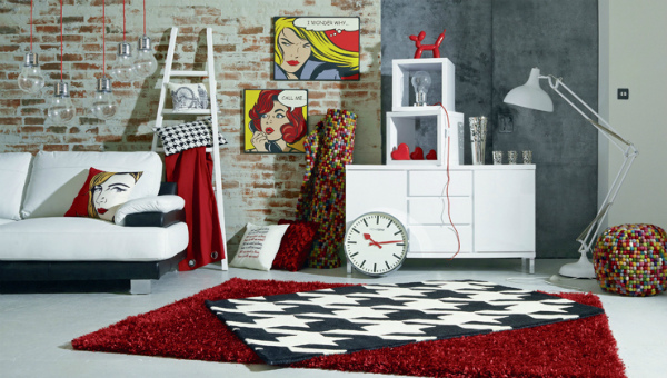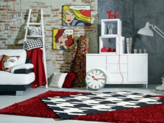 - Pop art. Une caractéristique clé de cette décoration est l'utilisation d'un juteux et jouant efficacement sur les contrastes de la gamme. Un excellent exemple de design pop-art d’une pièce implique l’utilisation d’une brique légèrement blanchie et d’un canapé peint dans une riche couleur vive. Cette combinaison peut être rendue encore plus remarquable grâce à un jeu texturé réussi.