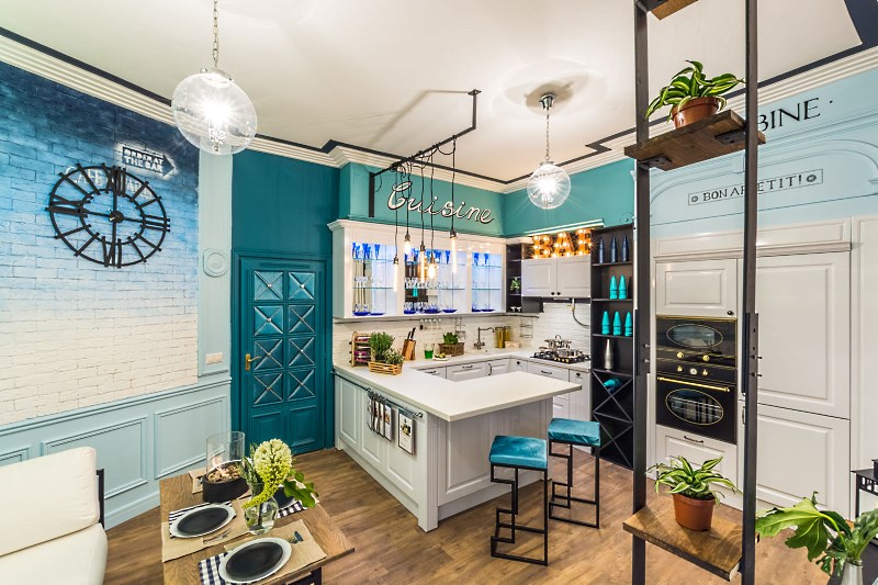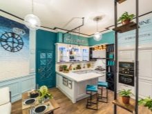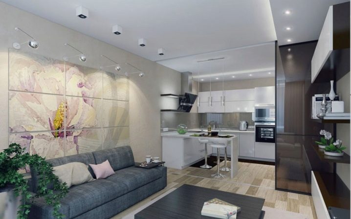 - Séparez l'un ou l'autre domaine fonctionnel en utilisant des matériaux de finition contrastés. Si votre studio dispose d'une cuisine et d'un salon combinés, vous pouvez alors décorer la cuisine dans des tons clairs et la zone de repos elle-même est plus sombre et plus saturée.De plus, le zonage peut être complété par différents revêtements de sol.