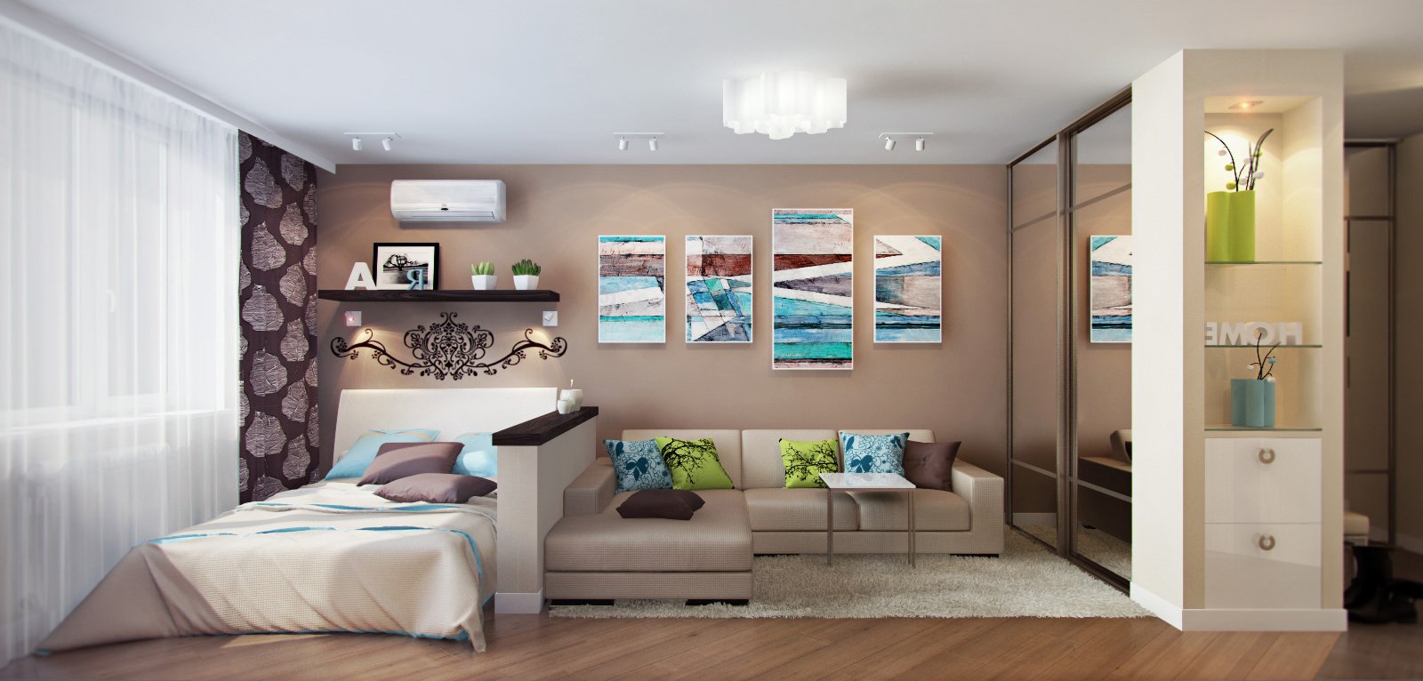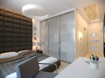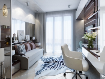 - Lorsque vous associez une pièce ou un salon à une chambre, il est préférable de placer le lieu de couchage aussi loin que possible de l'entrée de la pièce. Ceci est fait pour s'assurer que la partie principale et la partie couloir de la pièce sont utilisées pour recevoir des invités.