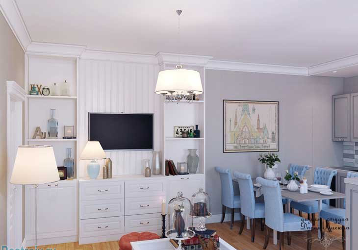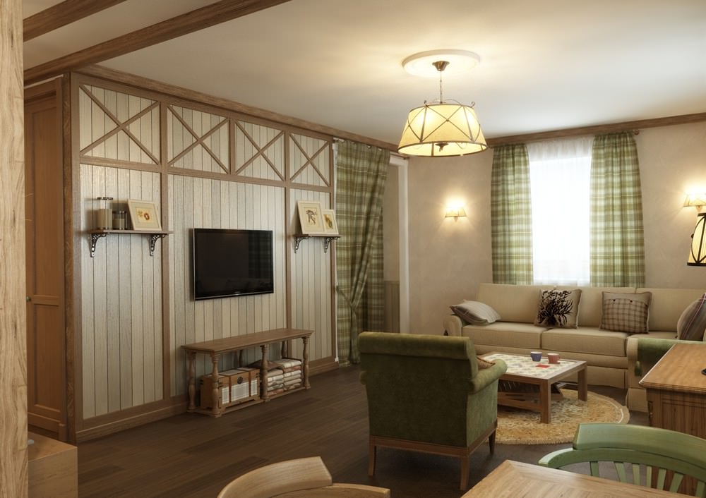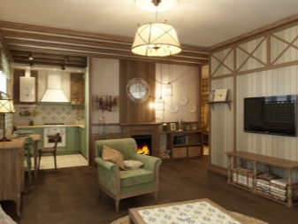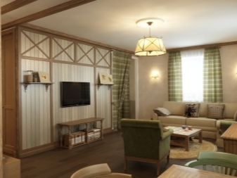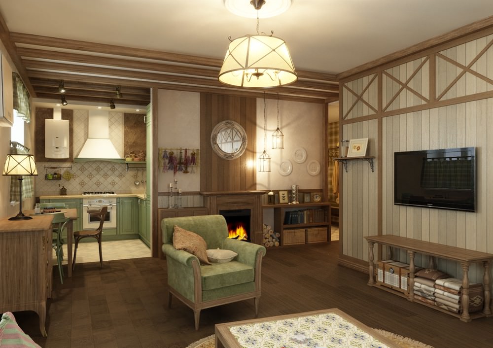 Si vous aimez une atmosphère très confortable et chaleureuse, vous pouvez organiser un salon combiné. style campagnard et provence. Ces styles sont très "amour" beaux matériaux de décoration et de mobilier, stylisé antique.De plus, s’il est avantageux de battre l’intérieur de ces styles, vous pouvez obtenir une chambre très confortable, comme en Provence française.