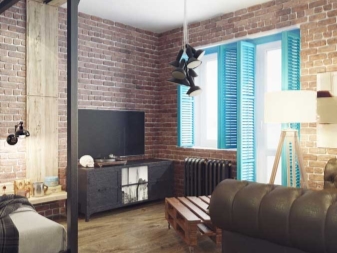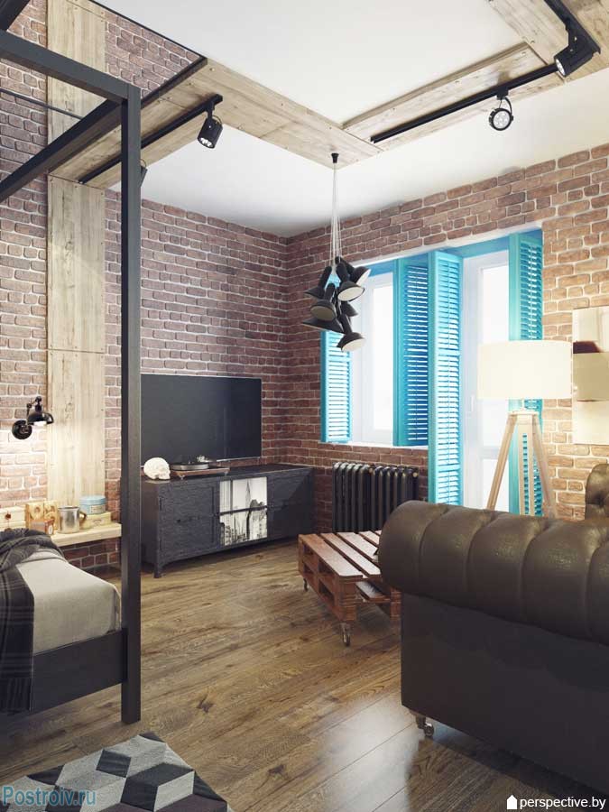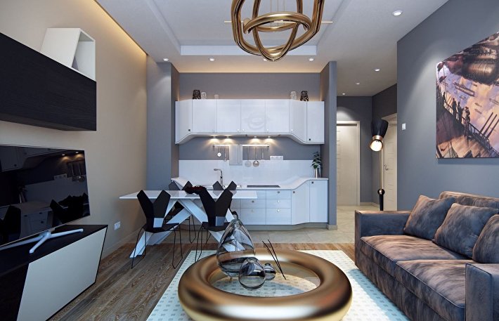 Faire de la place pour un jeune homme, une attention particulière devrait être accordée à la salle de séjour, combinée à la cuisine dans le style loft. Une certaine négligence de ce style et des matériaux de finition spécifiques aideront à diversifier de manière idéale la tanière de bacheliers de tout homme ou jeune homme.