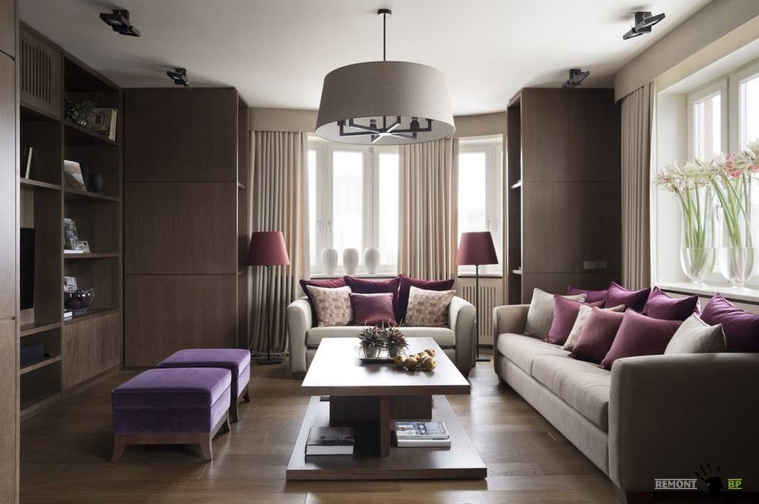 - Les petites familles du salon ont une chambre à coucher, utilisant une disposition libre, qui peut être changée avec le temps. Pour cela, les cloisons décoratives sont le plus activement utilisées.