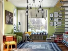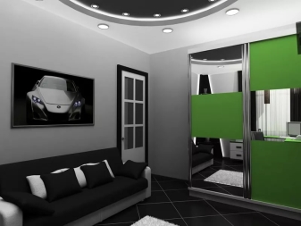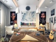 Le design choisi de la pièce et les préférences personnelles du mec qui y vit déterminent le type de textile et les éléments de décoration.Le niveau d'éclairage doit correspondre à la taille de la pièce: si la pièce mesure par exemple 16 ou 18 mètres carrés. m, vous devez trouver la quantité optimale de lumière pour cela. Cela devrait être suffisant, mais pas trop.