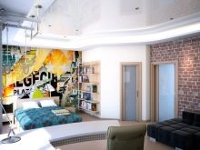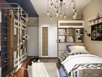 Lorsque les souhaits stylistiques des frères sont clarifiés, il est nécessaire de délimiter visuellement l'espace afin que chacun ait sa propre moitié de la pièce qui correspond à ses intérêts. Si la zone est suffisamment grande, vous pouvez monter cette partition, permettant ainsi à chacun d’avoir un espace personnel. Pour économiser de l'espace dans la salle permettra différents meubles avec la fonction de transformation.Avec l’assentiment des jeunes, vous pouvez installer un lit superposé dans la pièce pour laisser plus de place à d’autres objets.