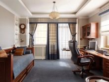 Le style classique, élaboré selon toutes les règles, semblera pertinent pendant de nombreuses années. La réparation ne sera donc nécessaire qu'en cas d'urgence. Cette option est peut-être la plus universelle, mais même il peut montrer un caractère principalement "masculin", et pour y parvenir, c'est assez simple. Vous aurez besoin de meubles en bois sombre, de parquet, de plâtre vénitien pour murs, qui a une teinte neutre. Au lieu de cela, le dernier fond d'écran en forme correspond. Les fausses poutres au plafond donneront un aspect particulier à l'aspect de la pièce.