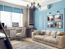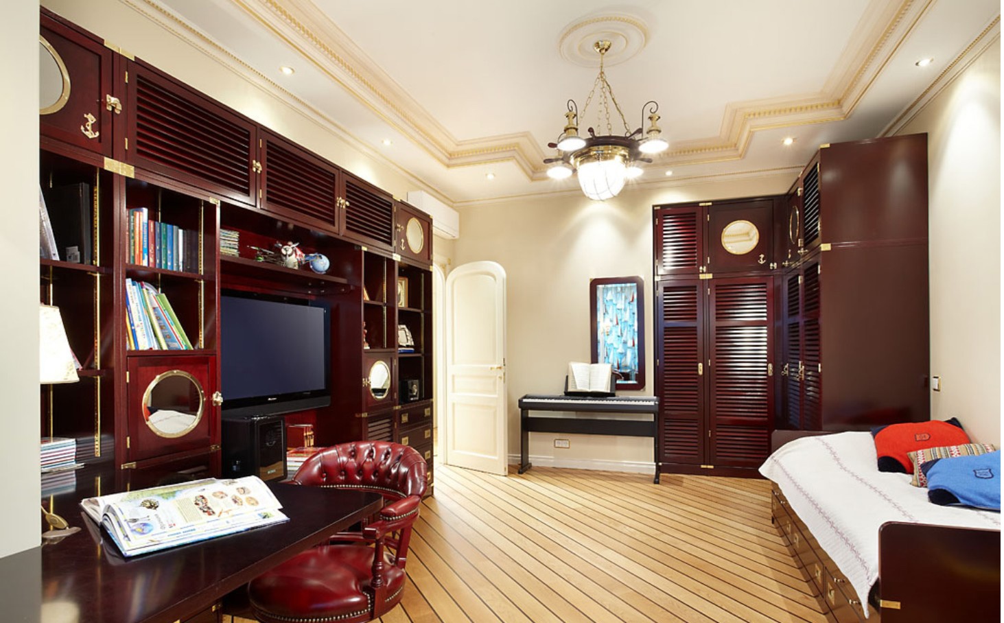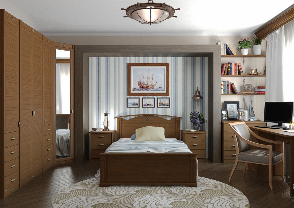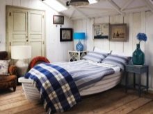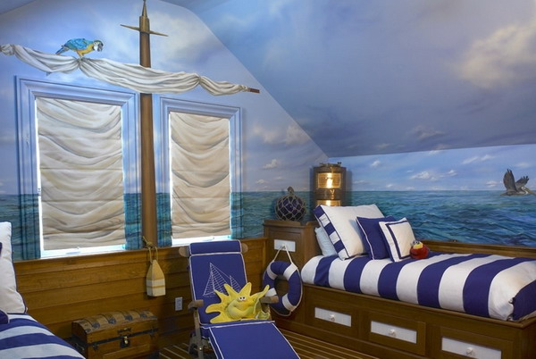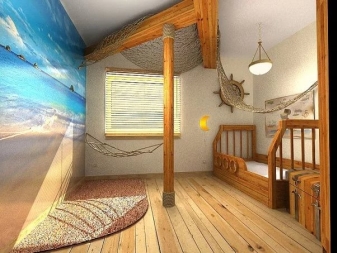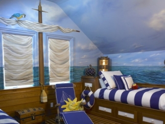 Les couleurs de l'intérieur présenté correspondent aux ombres des vagues et du soleil dans diverses manifestations. Il y a toutes les nuances de bleu, bleu, jaune, sable et autres couleurs appropriées. Une telle pièce ne peut se passer de mettre en valeur le thème choisi du décor: des paysages marins magnifiques, des maquettes de navires, des statuettes de créatures marines, des cartes et de nombreux autres éléments.En tant que dispositifs d'éclairage, nous prenons des modèles de lampes et de lampes de chevet, similaires à ceux que l'on rencontre habituellement, par exemple sur les navires. En tant que matériaux, il est préférable d’utiliser un arbre peu foncé ayant subi un vieillissement spécial ou aucun traitement.