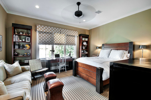 Ce style est facilement reconnaissable à la retenue et à la concision. L'essentiel - l'absence d'un grand nombre de pièces. Il est parfait pour créer des conditions confortables pour un jeune homme, car il prévoit une division claire dans les zones nécessaires. Bien qu’il n’y ait pas beaucoup de meubles ici, un attribut obligatoire est un bon dressing, où il sera possible de ranger de nombreux vêtements et pas seulement. Un tel intérieur convient particulièrement à une personne pour qui le travail est vraiment important. Les éléments étrangers ne seront pas distraits des affaires, et il sera possible de se concentrer pleinement au travail et ensuite - de se reposer facilement, sans toutefois attirer votre attention.