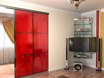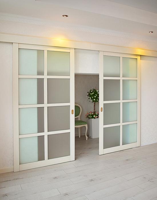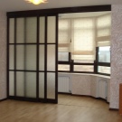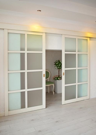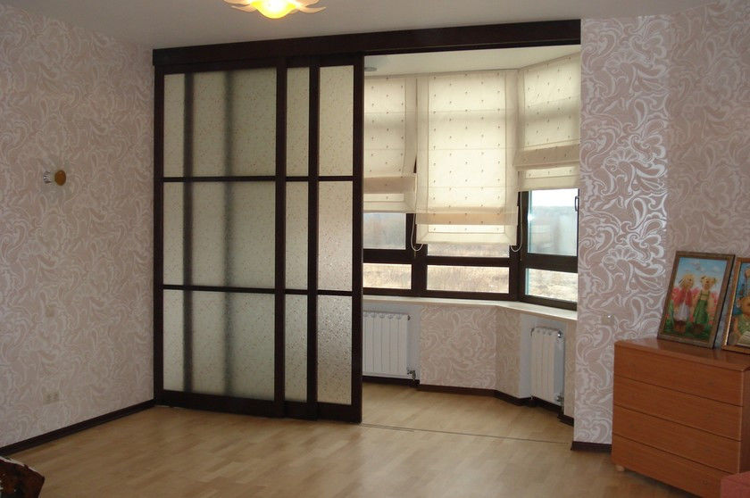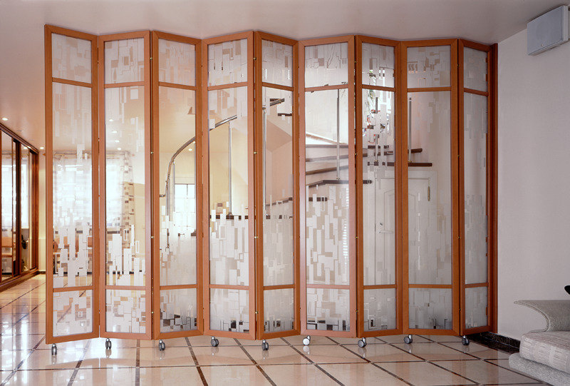 - Cloison coulissante interroom Cela peut être très utile si vous souhaitez séparer, par exemple, une zone de loisirs. Une telle cloison peut être constituée de n'importe quel matériau. L'aspect le plus avantageux des modèles translucides avec différents motifs, réalisés par type de dentelle.