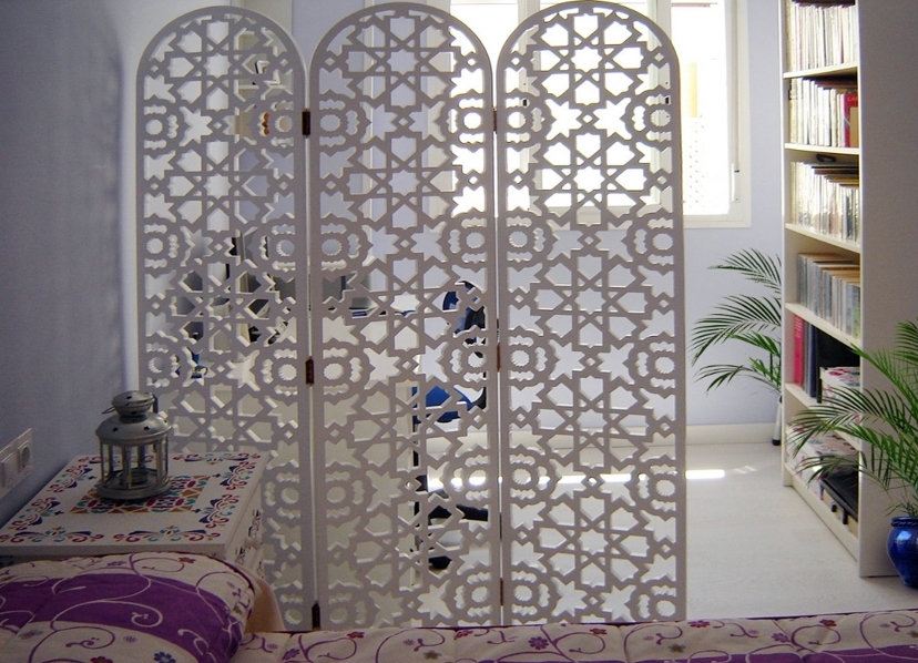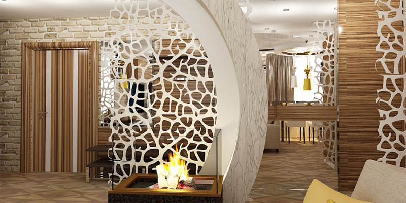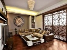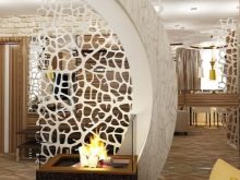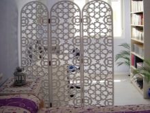 - Des partitions ou des écrans sculptés peuvent permettre aux ménages de se plonger dans un conte oriental. Les détails miniatures luxueux et la dentelle ne pourront pas ignorer non seulement le ménage, mais aussi les invités. Avec toute sa diversité aujourd'hui, de telles cloisons peuvent être installées même dans les intérieurs modernes.