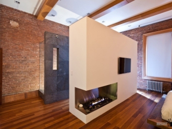 Certains locataires utilisent très souvent divers racks comme cloisons et créent également des «murs vivants». Les fleurs et les verts qu'ils contiennent ne doivent pas nécessairement être réels. Cheminées non communes et décoratives pouvant diviser plusieurs zones indépendantes et fonctionnelles.