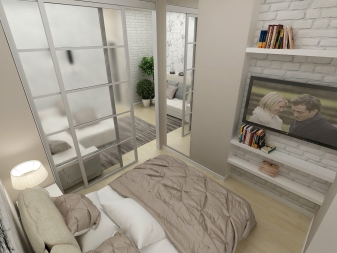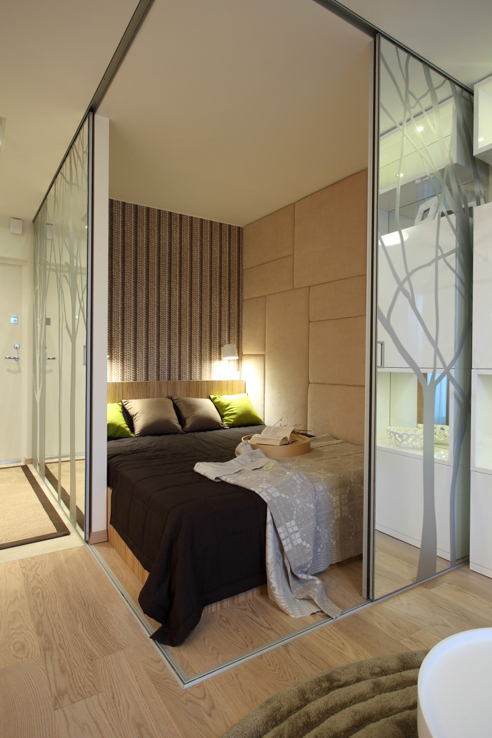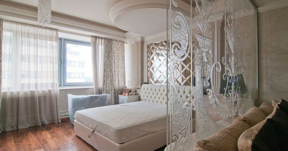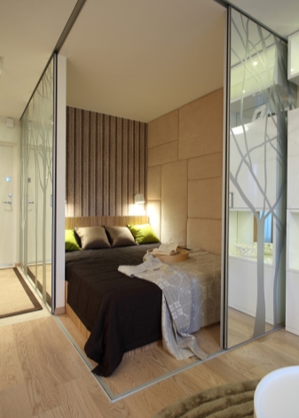 - Pas rare, quand pour la séparation de la chambre à coucher et autres pièces utilisent cloisons miroir, car une telle technique est considérée comme très multifonctionnelle. De plus, le miroir est toujours utile dans la maison.