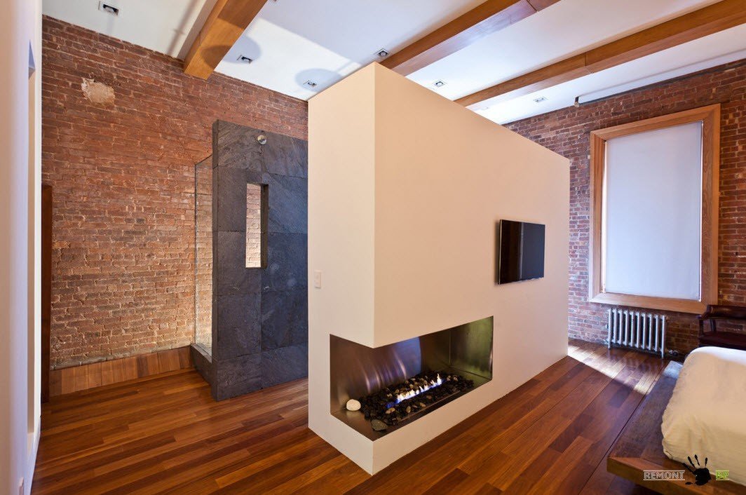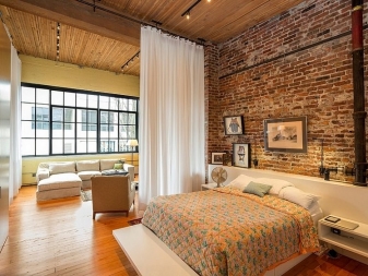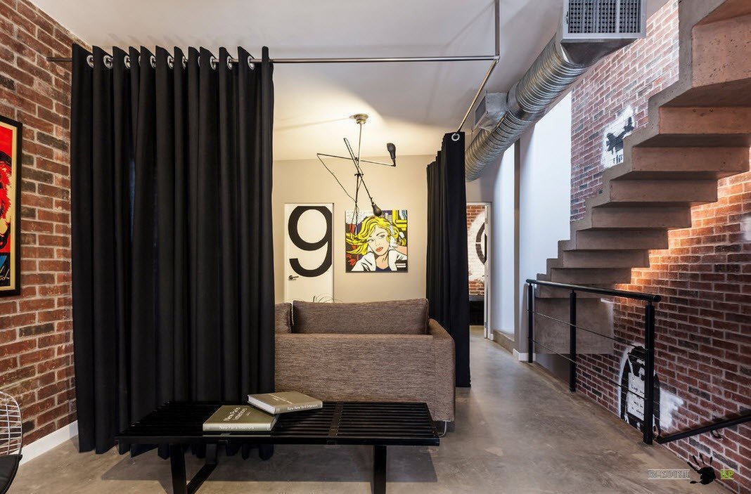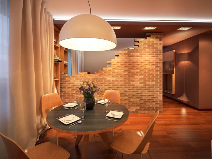 Zonage avec une brique aura l'air très inhabituel. Souvent, les concepteurs fabriquent le soi-disant "mur inachevé", qui divise en quelque sorte plusieurs pièces. Cette technique est particulièrement pertinente pour le style loft.