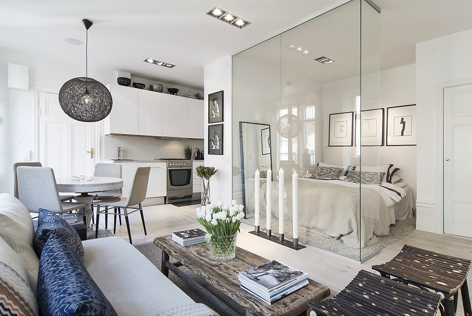 - Il est préférable de séparer les très petites pièces par des cloisons transparentes, qui souvent même agrandir visuellement la pièce.