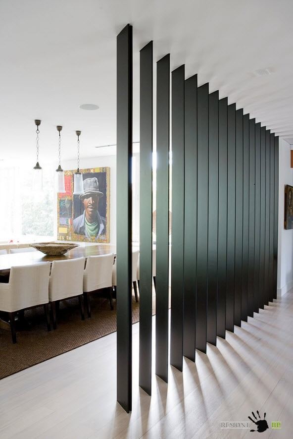 - Les cloisons sont disponibles non seulement dans une variété de couleurs, mais également dans des modèles. Parmi la large gamme, vous pouvez trouver les modèles d’écrans les plus simples, ainsi que des options plus complexes et constructives qui seront fixées au sol et au plafond.