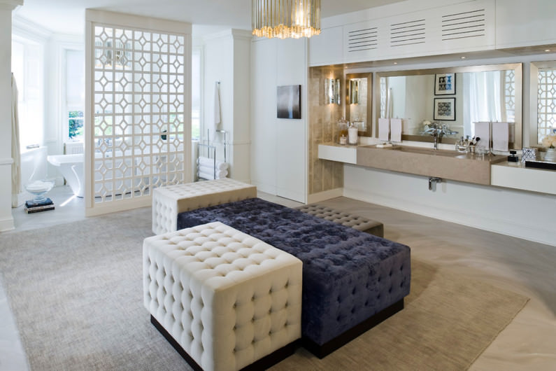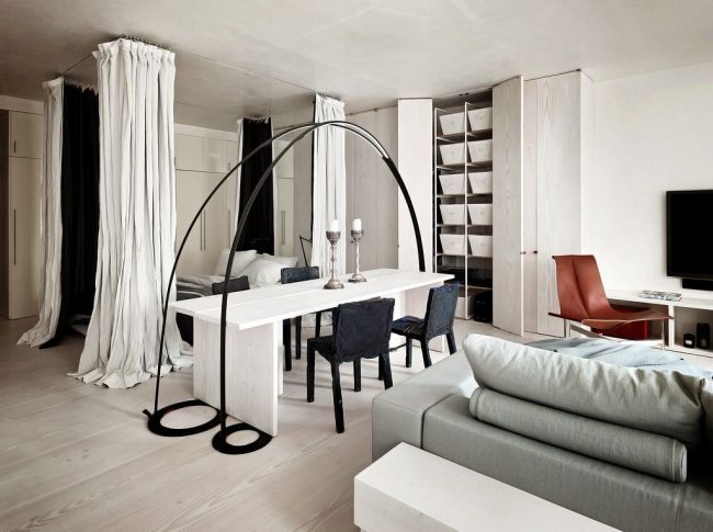 Le zonage des rideaux et autres textiles semble coûteux et élégant. En outre, les experts recommandent de prêter attention aux écrans et cloisons sculptés en blanc. Le blanc est une couleur fonctionnelle à ajouter à n'importe quel intérieur.
