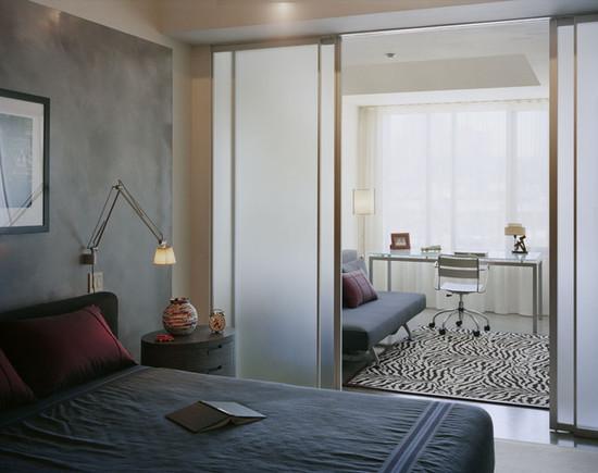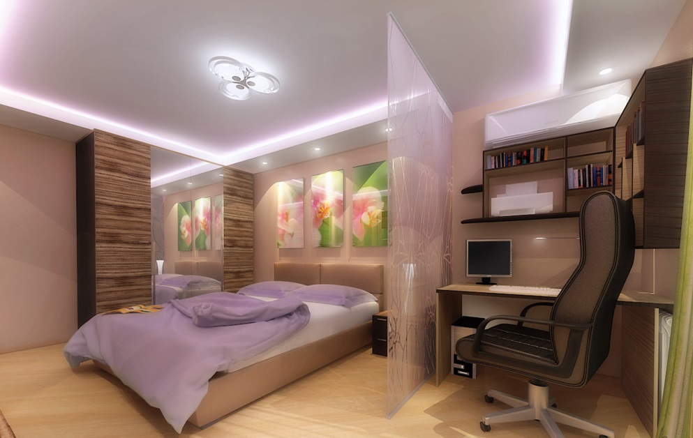 - Dans la chambre Très souvent, cette pièce est combinée avec le bureau. Pour plus de commodité, plusieurs zones peuvent être divisées à l'aide d'une partition coulissante ou d'un écran classique.