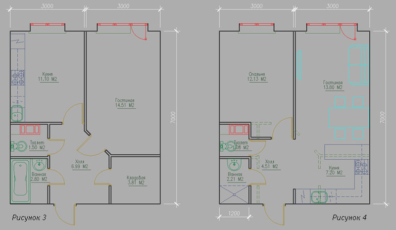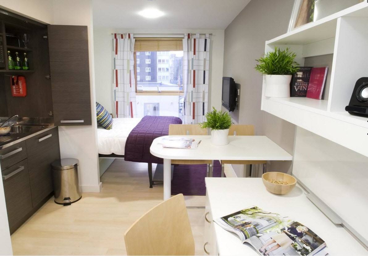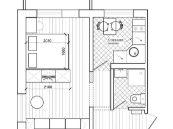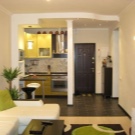 Un petit appartement d'une pièce peut également être converti en une habitation composée de trois zones fonctionnelles. Pour le réaménagement, ils utilisent généralement la démolition du mur de la cuisine. Grâce à cela, la pièce deviendra une forme carrée et offrira d’énormes possibilités de design. Il est également possible dans ce cas d’appliquer la version angulaire du placement des pièces.